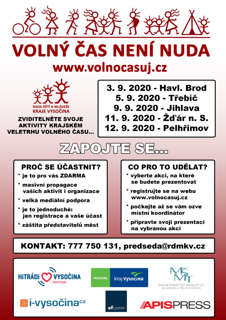 “Volný čas není nuda” je největší krajský veletrh volného času, který každororočně na začátku září organizujeme ve všech pěti okresních městech kraje Vysočina. Na začátku září je připraven další ročník veletrhu volného času.